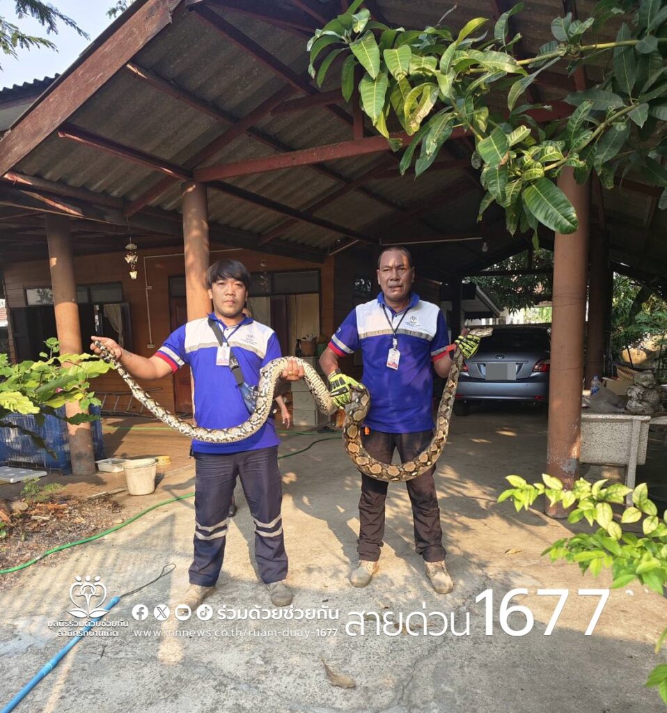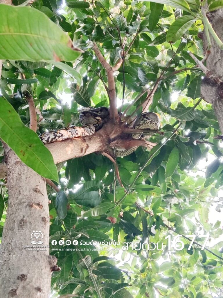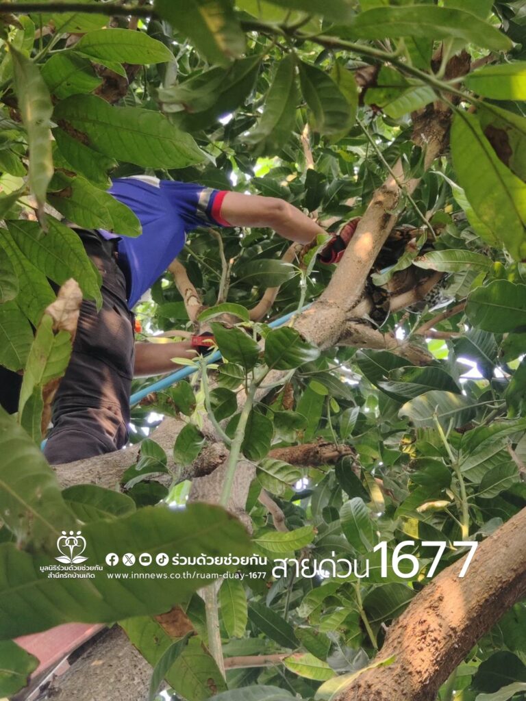 อาสาร่วมด้วยฐานคุ้มภัย ให้การช่วยเหลือประชาชนจับงูเหลือมยาว 4 เมตรอยู่บนต้นไม้บริเวณบ้านพัก ซอยกาญจนาภิเษก 11/1 เขตทวีวัฒนา กรุงเทพฯ