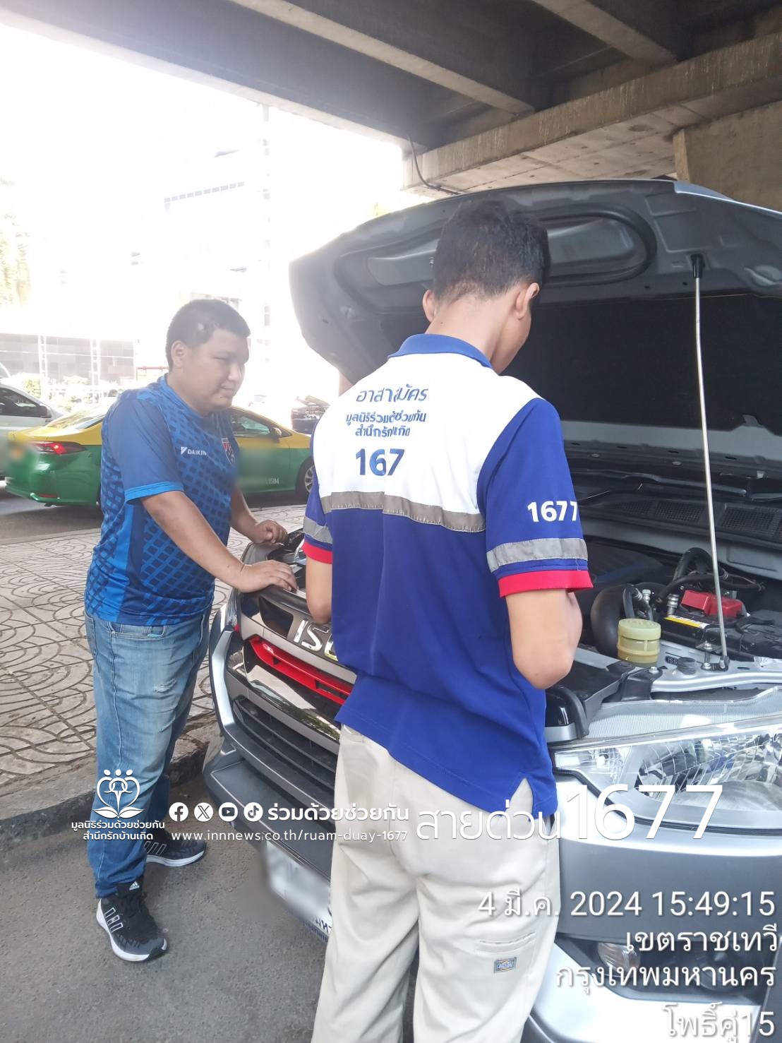 คุณธนกิจ ขอความช่วยเหลือรถสตาร์ทไม่ติด รถกระบะอีซูซุ สีบรอนซ์ จอดอยู่บริเวณแยกราชปรารภ แขวงมักกะสัน เขตราชเทวี กรุงเทพฯ ศูนย์สื่อสารร่วมด้วยช่วยกัน ประสาน อาสาร่วมด้วยฐานโพธิ์คู่ เข้าไปช่วยเหลือ