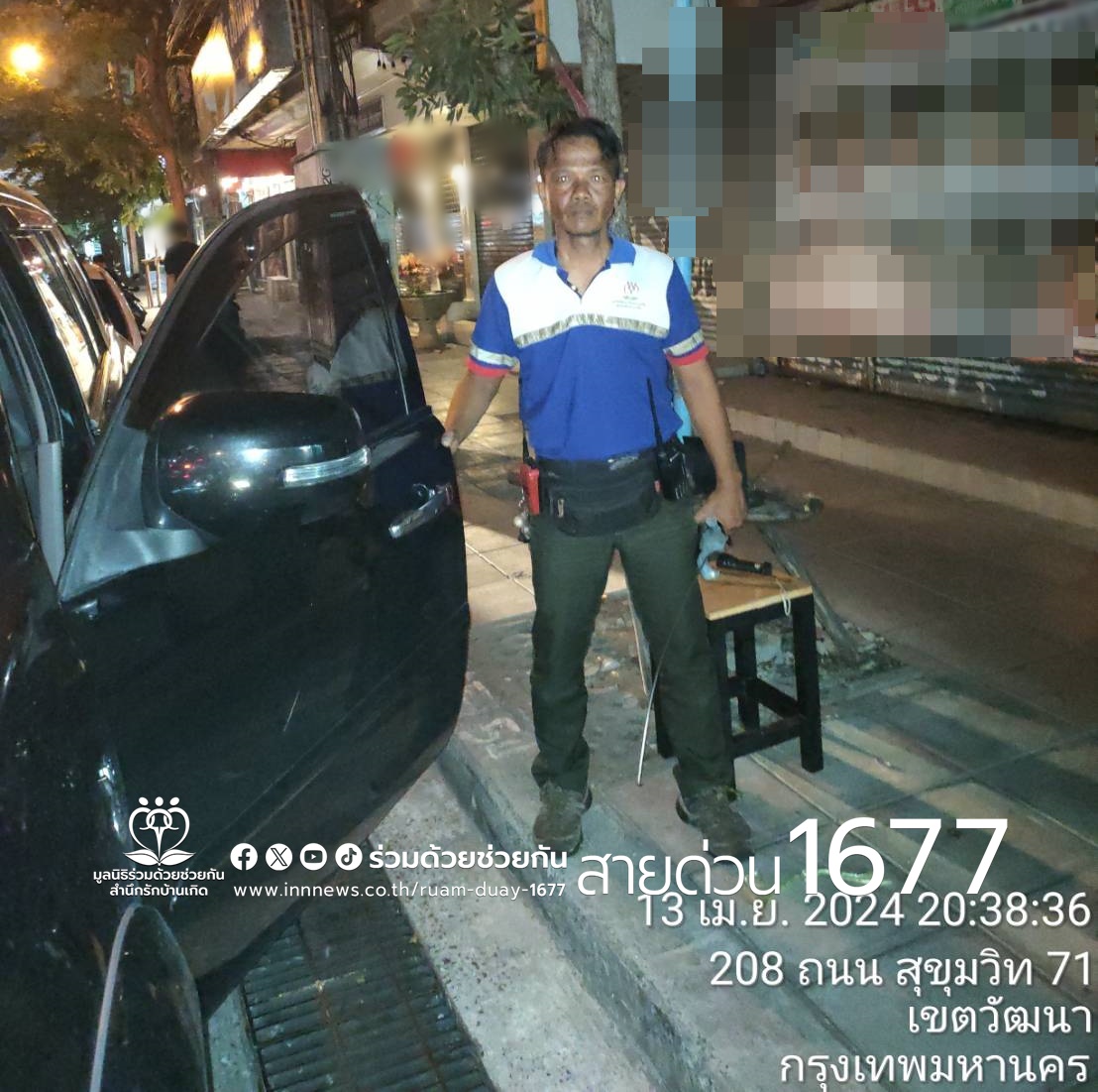ตรวจสอบพบว่าลืมกุญแจไว้ในรถ ไม่สามารถเปิดประตูได้ อาสาจึงนำอุปกรณ์เฉพาะทางช่วยเปิดประตูได้สำเร็จ นำกุญแจออกจากรถมอบให้เจ้าของเป็นที่เรียบร้อย