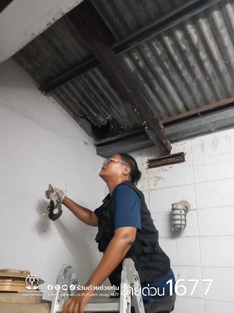 ประชาชนโทร.1677 ขอความช่วยเหลือ มีลูกแมวจรจัดตกจากหลังคาบ้าน แม่แมวร้องเรียกหา ประสานอาสาร่วมด้วยเข้าช่วยเหลือ