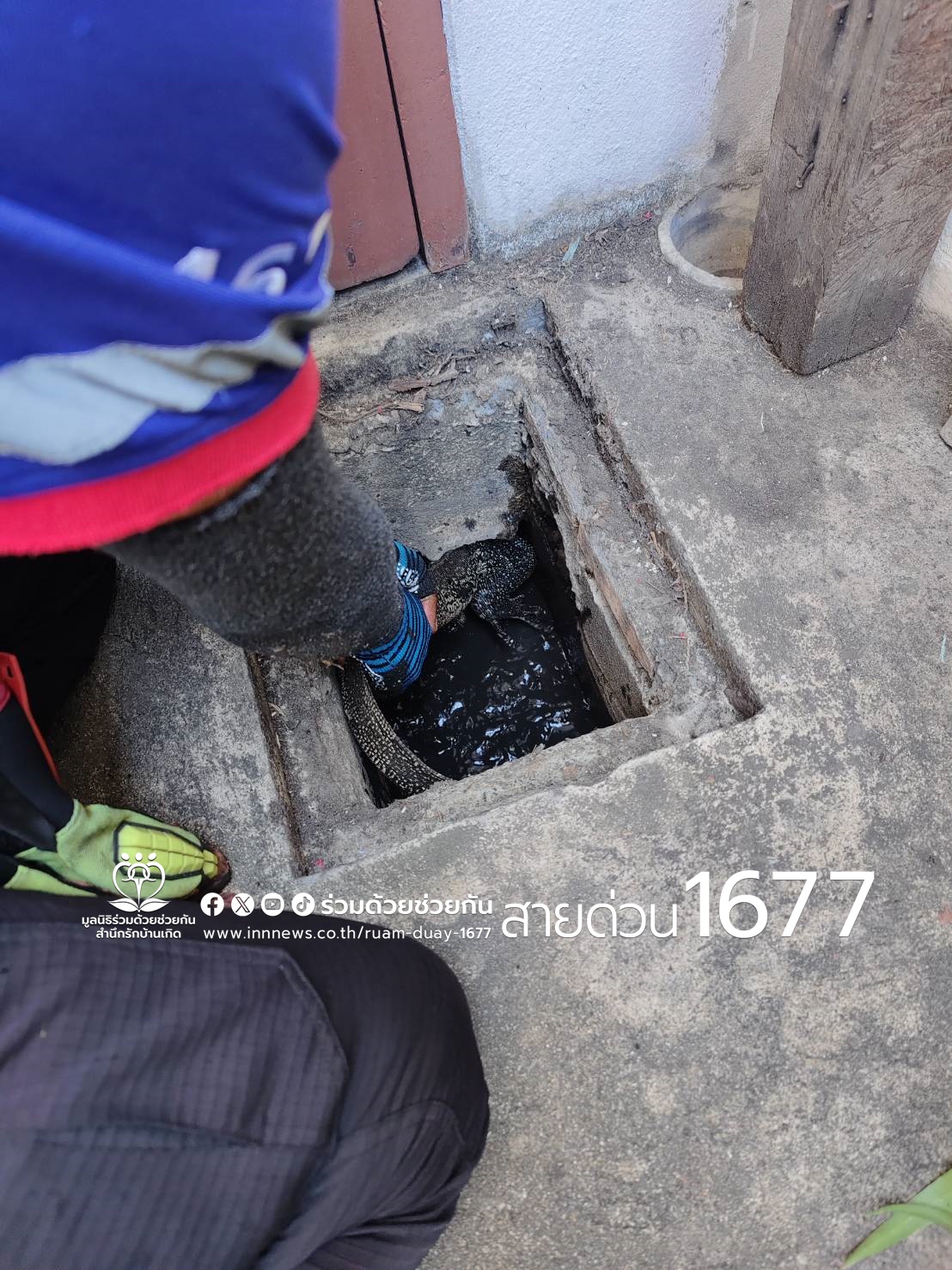 เจ้าของบ้านถึงกับตกใจ ตัวเงินตัวทองติดท่อ แจ้งอาสาช่วยได้สำเร็จ