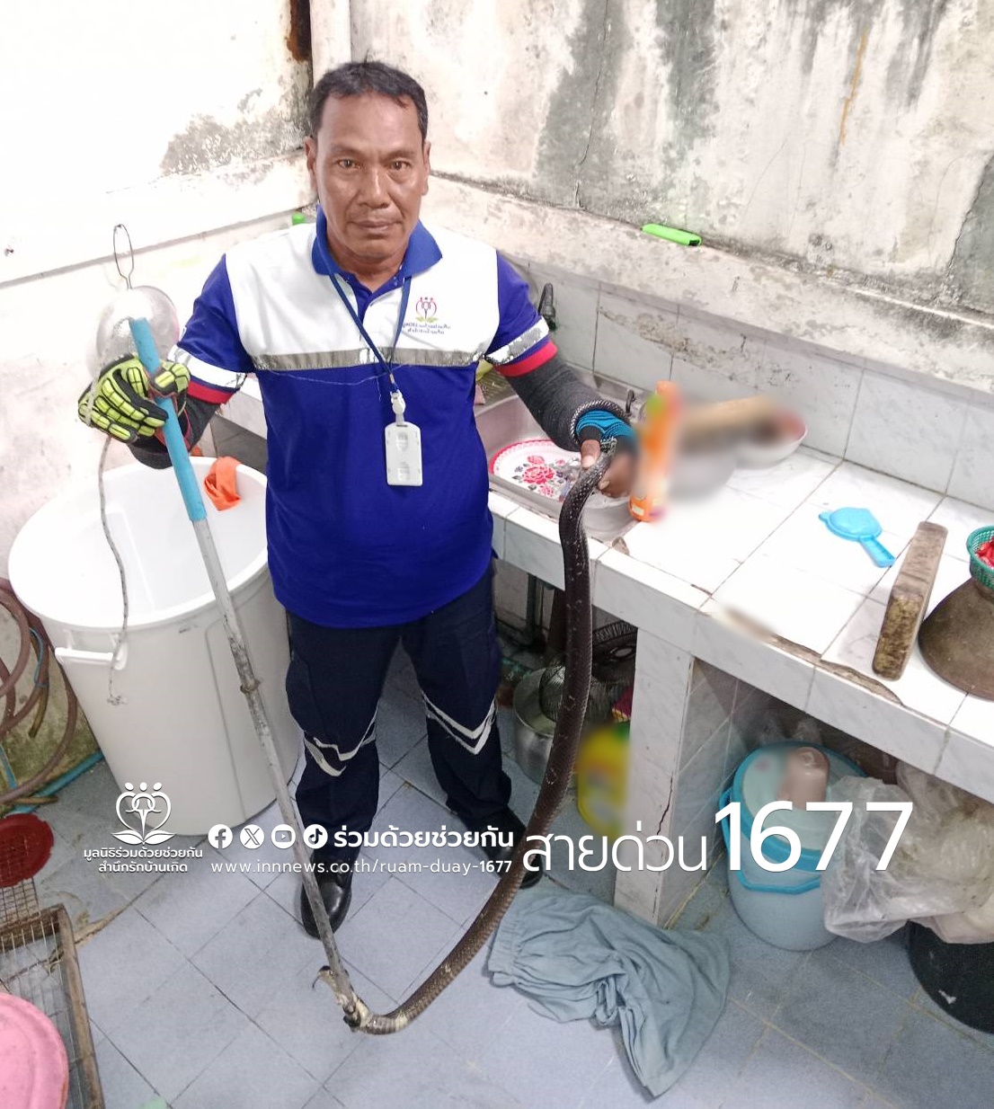 อาสาร่วมด้วยช่วยกัน รับแจ้งจากประชาชนขอความช่วยเหลือ งูเห่าเลื้อยเข้ามาซุกอยู่ในห้องครัว ซอยเจริญพัฒนา 6 แขวงบางชัน เขตคลองสามวา กรุงเทพฯ เกรงจะเกิดอันตราย อาสาจึงเดินทางเข้าไปช่วยจับงู