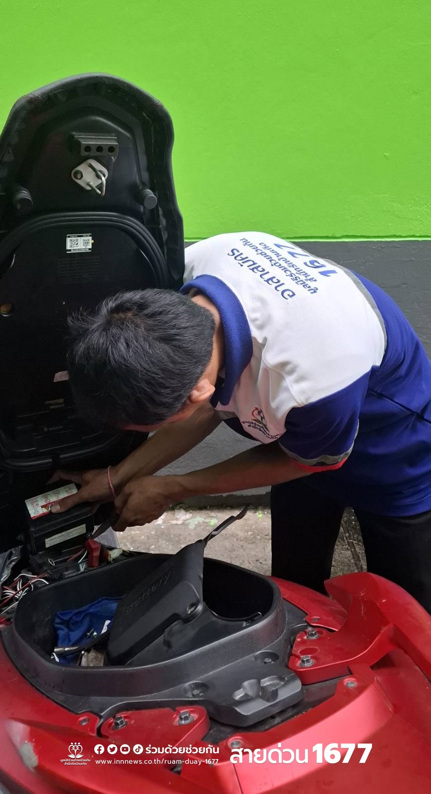 อาสาร่วมด้วยช่วยกันเดินทางเข้าไปตรวจสอบ พบรถจักรยานยนต์ มาลากูติ สีแดงดำ สตาร์ทไม่ติด จึงช่วยเหลือพ่วงแบตเตอรี่ให้สำเร็จ สามารถเดินทางต่อไปได้ตามปกติ