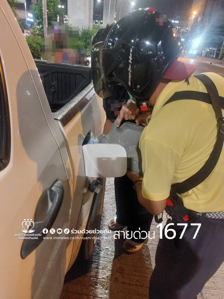 รถประชาชนจอดเสียน้ำมันหมด อยู่ถนนศรีนครินทร์ ขาออก อาสาร่วมด้วยไปจัดซื้อน้ำมัน และนำกลับไปเติมให้เป็นที่เรียบร้อย