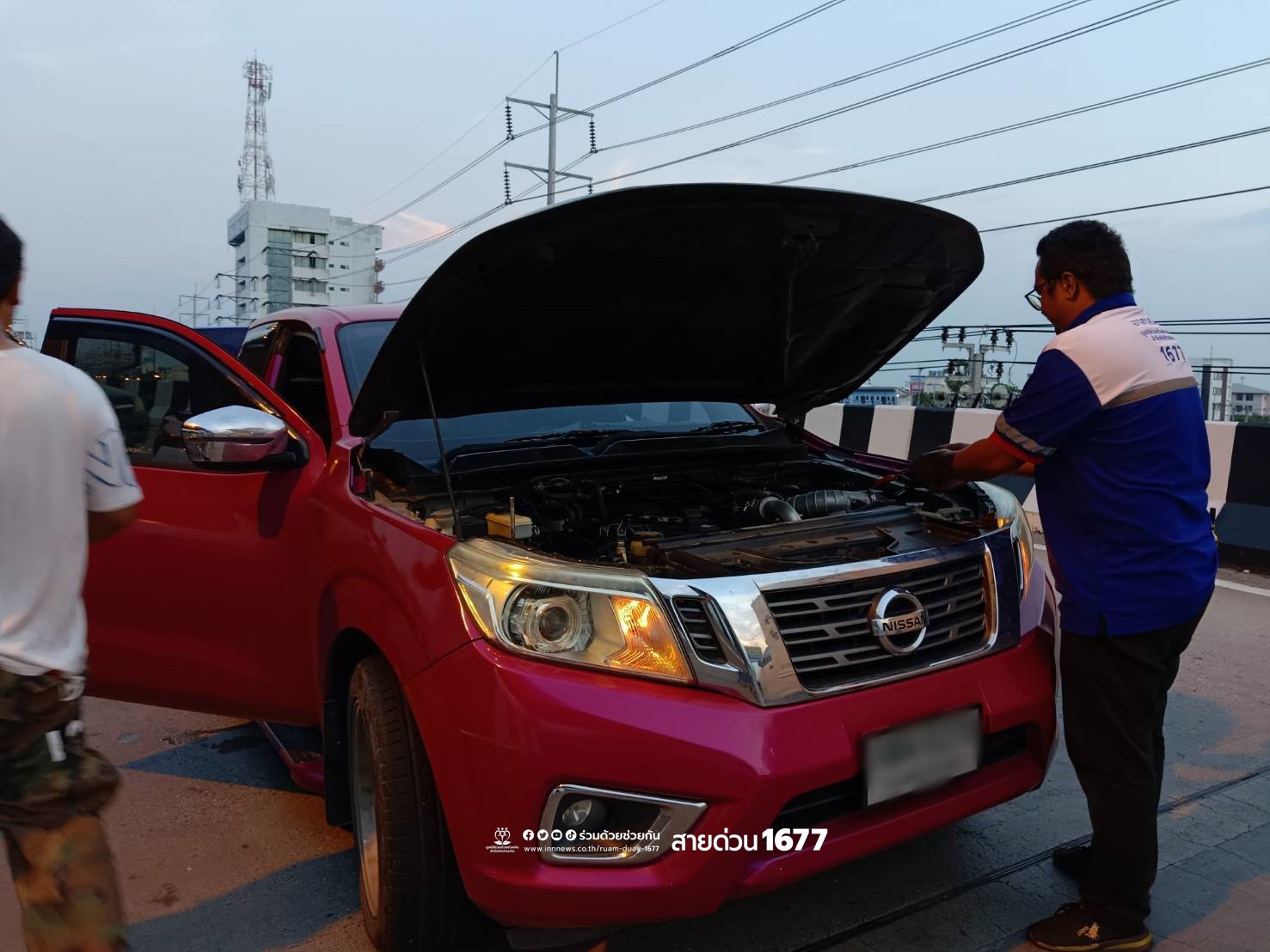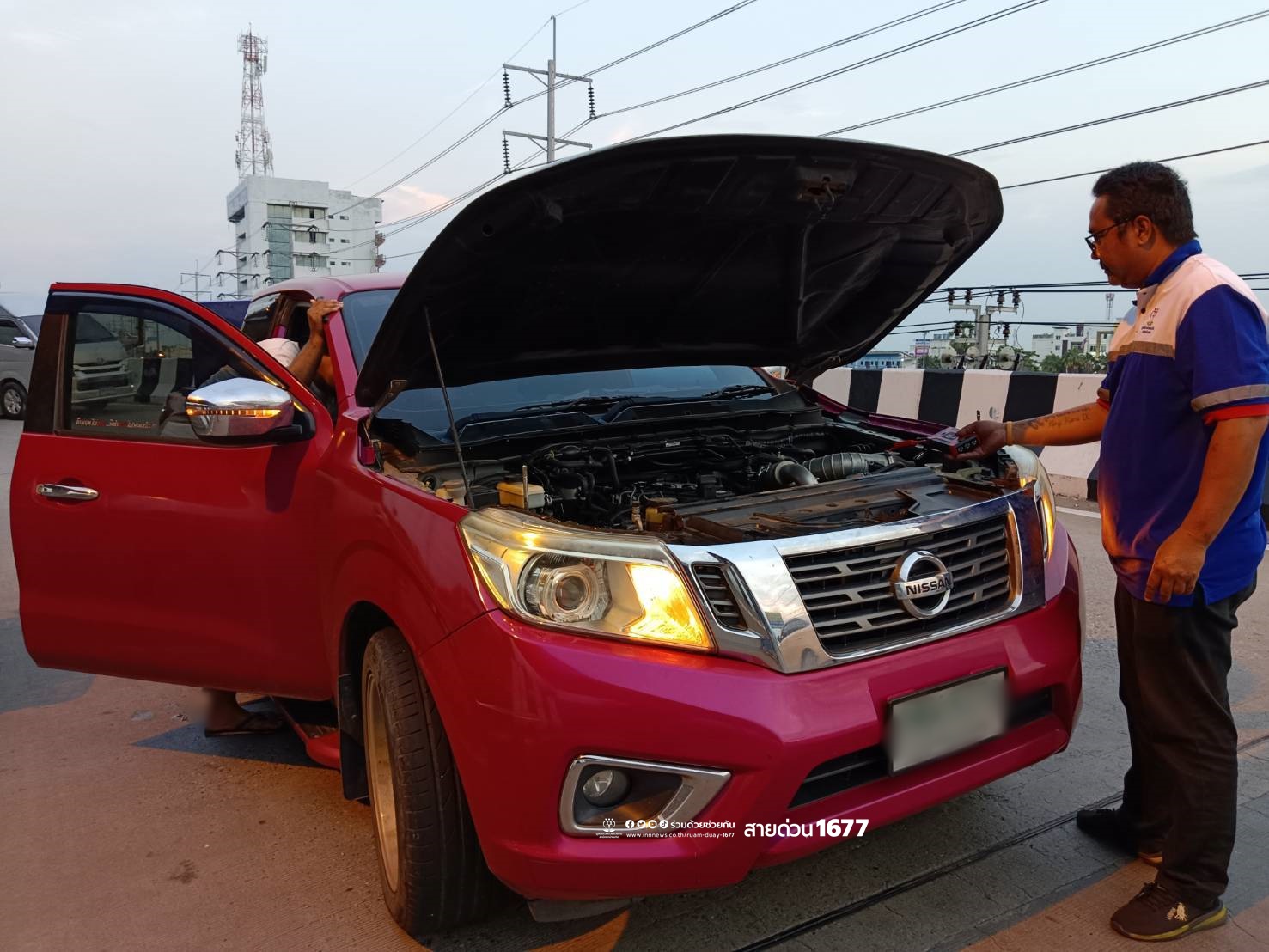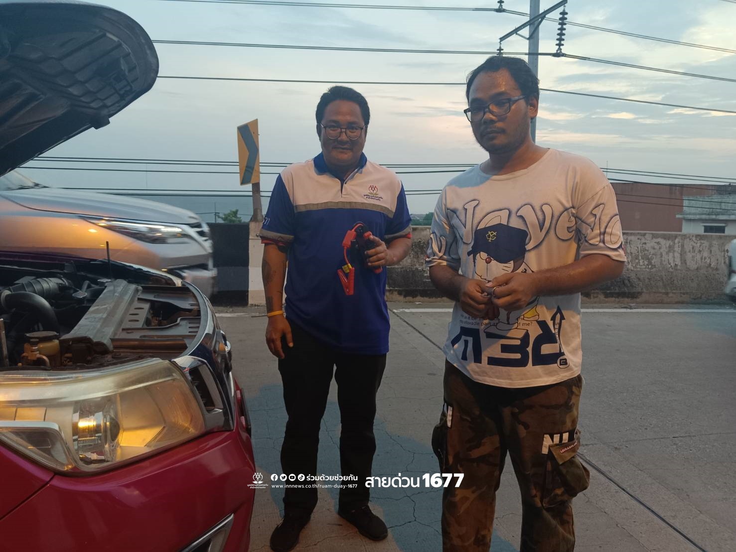 อาสาร่วมด้วยช่วยกันตรวจสอบ พบรถกระบะนิสสัน สีแดง จอดอยู่ สตาร์ทไม่ติดสาเหตุเกิดจากแบตเตอรี่หมด จึงช่วยพ่วงแบตเตอรี่ให้ จนรถสตาร์ทติด สามารถเดินทางต่อไปได้ตามปกติ