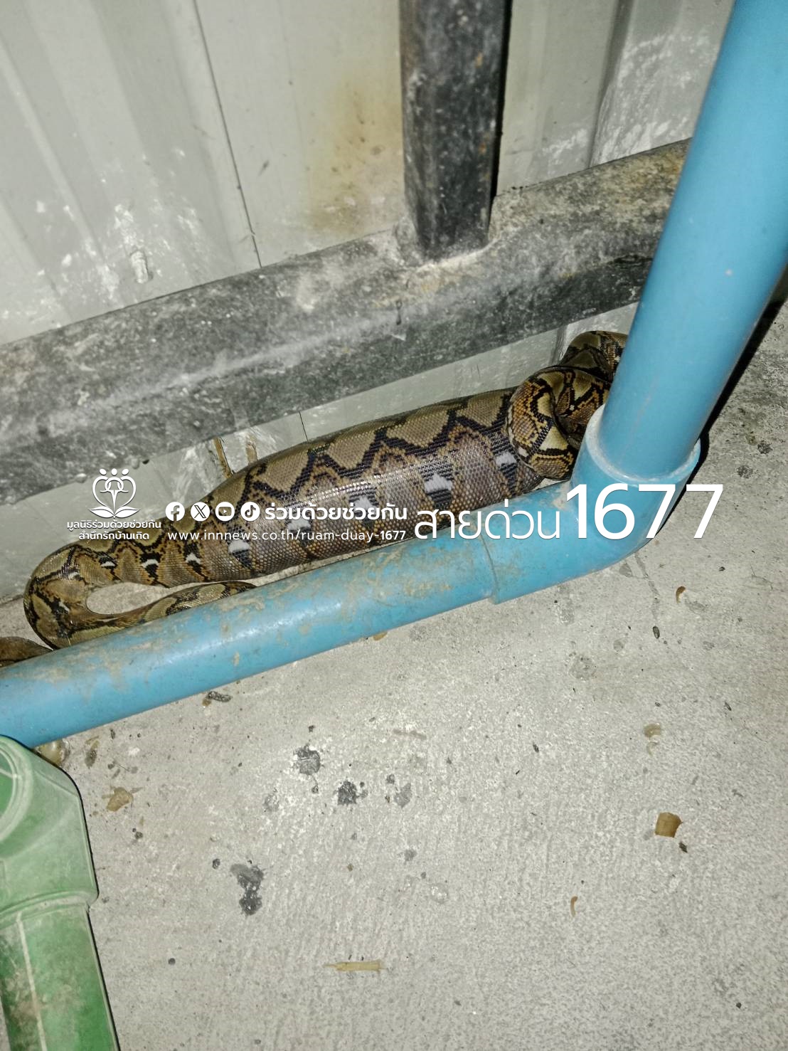 คุณกนกนุช ขอความช่วยเหลือจับงูเหลือม ที่ร้านซักผ้า ซอยหทัยราษฎร์ 37 ถนนหทัยราษฎร์ แขวงสามวาตะวันตก เขตคลองสามวา กรุงเทพฯ งูเหลือมอยู่หลังร้าน นอนขดตัวอยู่ ไม่เลื้อยหนีเพราะเพิ่งกินหนูเข้าไป ต้องการอาสาให้การช่วยเหลือ