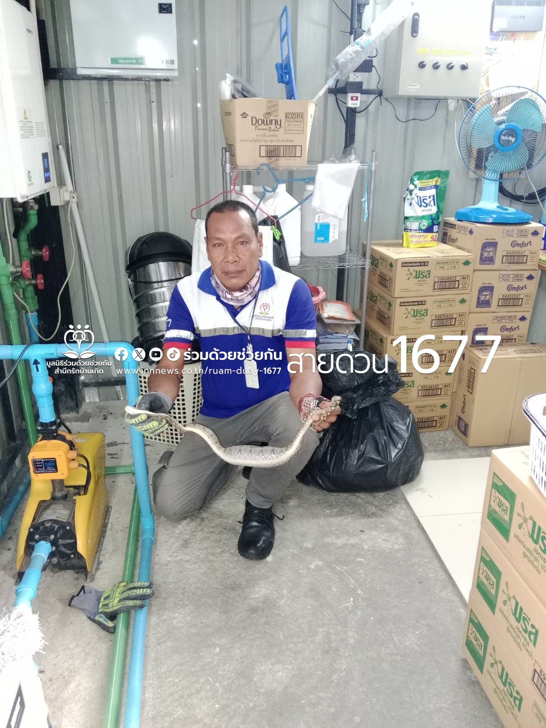 ศูนย์สื่อสารร่วมด้วยช่วยกัน ประสาน อาสาร่วมด้วยคุ้มภัย 006 ไปให้การช่วยเหลือ ตรวจสอบพบงูเหลือม 1 ตัว ความยาวประมาณ 50 เซนติเมตร ดำเนินการจับงูได้สำเร็จ พร้อมนำปล่อยคืนสู่ธรรมชาติห่างไกลบ้านเรือนประชาชนเรียบร้อยแล้ว