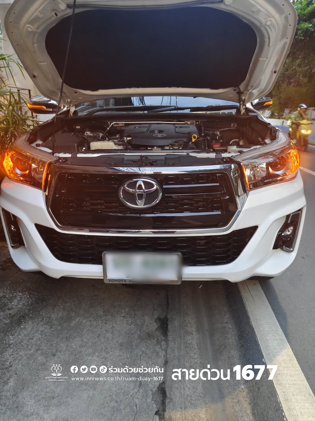 อาสาร่วมด้วยช่วยกันตรวจสอบ พบรถกระบะโตโยต้าจอดอยู่ข้างทาง สตาร์ทไม่ติดสาเหตุเกิดจากแบตเตอรี่หมด จึงช่วยพ่วงแบตเตอรี่ให้ จนรถสตาร์ทติด สามารถเดินทางต่อไปได้