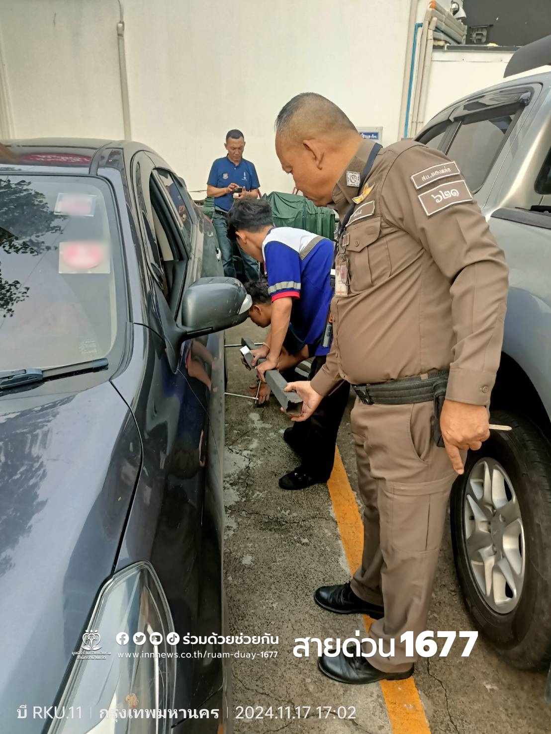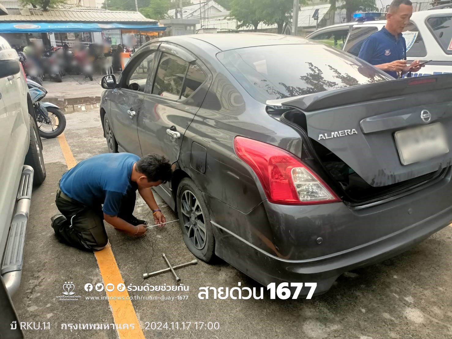 ตรวจสอบพบรถเก๋งนิสสัน สีเทา ล้อหลังซ้ายยางรั่ว อาสาพร้อมเจ้าหน้าที่ตำรวจ ช่วยเปลี่ยนล้อยางให้ สามารถเดินทางต่อไปได้ตามปกติ พื้นที่ สน.ทองหล่อ