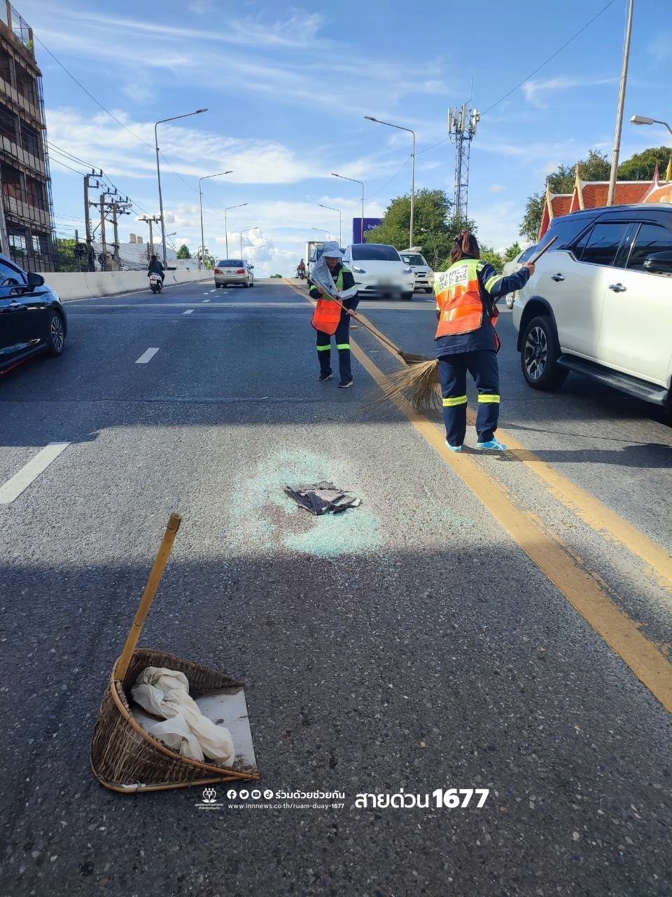 ล่าสุด เวลา 15.32 น. เจ้าหน้าที่กทม.เร่งเก็บกวาดเศษกระจกบนพื้นถนน เพื่อเปิดช่องจราจรให้สามารถกลับมาใช้ได้ตามปกติ
