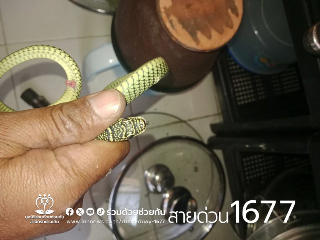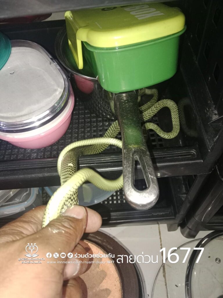 อาสาร่วมด้วยคุ้มภัย 006 ได้เข้าตรวจสอบพบเป็นงูเขียวพระอินทร์จำนวน 1 ตัว ความยาวประมาณ 1 เมตร หลบซ่อนตัวอยู่ใต้หม้อต้มบนชั้นวางของ จึงได้นำอุปกรณ์เข้าช่วยเหลือ ใช้เวลาไม่นาน ทำการจับตัวงูเอาไว้ได้เป็นผลสำเร็จ นำใส่ขวดน้ำ พร้อมนำไปปล่อยคืนสู่ธรรมชาติเป็นที่เรียบร้อย พื้นที่สน.มีนบุรี