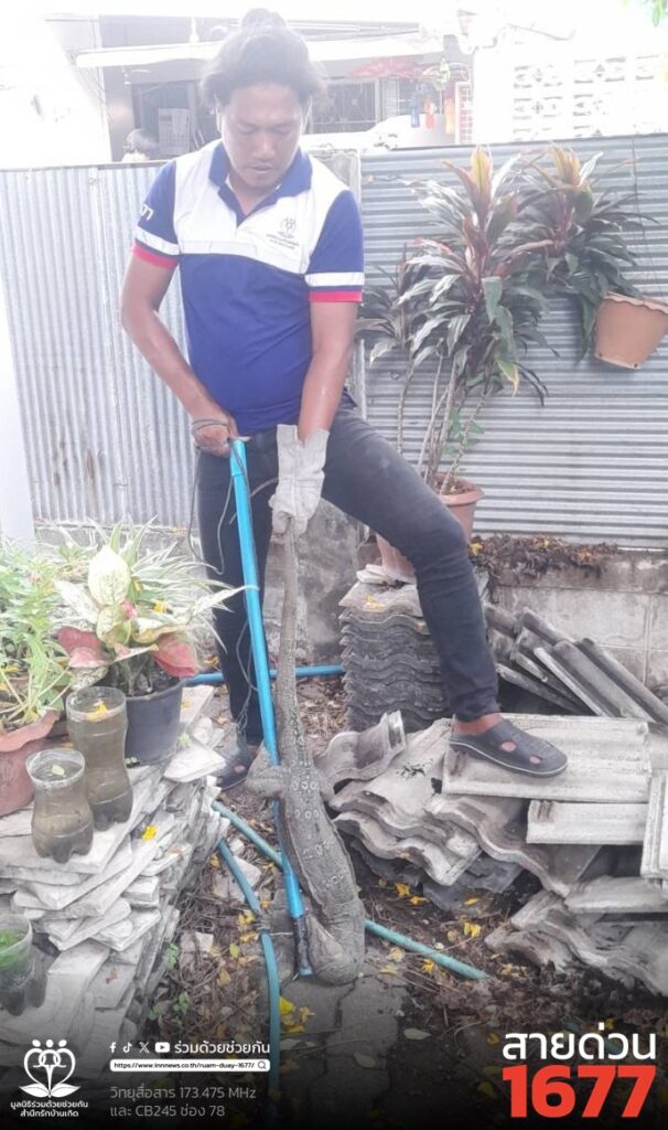 อาสาร่วมด้วยคุ้มภัย 026,071,072 ได้เข้าตรวจสอบพบเป็นตัวเงินตัวทองจำนวน 1 ตัว หลบซ่อนตัวใต้กองกระเบื้องบริเวณข้างบ้านพัก จึงได้นำอุปกรณ์เข้าช่วยเหลือ ทำการจับตัวไว้ได้เป็นผลสำเร็จ พร้อมนำใส่กระสอบ และนำไปปล่อยคืนสู่ธรรมชาติเป็นที่เรียบร้อย พื้นที่ สน.บึงกุ่ม