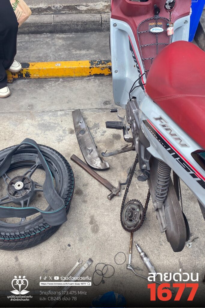รับแจ้งจากประชาชนขอความช่วยเหลือรถจักรยานยนต์ยางแตก ภายในปั๊มน้ำมันบางจาก ถนนพระราม 9 ซอย 43 แขวงสวนหลวง เขตสวนหลวง กรุงเทพฯ อาสาร่วมด้วยเฉลิมพระเกียรติ 15 ดำเนินการใช้อุปกรณ์ถอดล้อและเปลี่ยนล้อยางได้สำเร็จ สามารถขับขี่รถต่อไปได้
