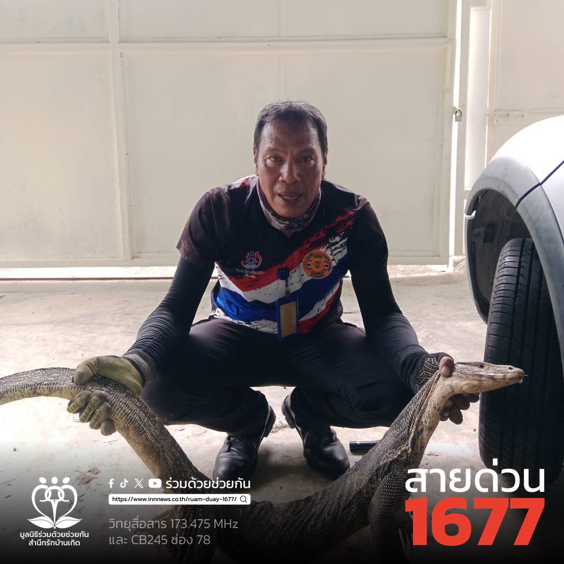 ไม่รู้มาตอนไหน ตัวเงินตัวทองติดซุ้มล้อรถ แจ้งอาสาช่วยจับวุ่น
