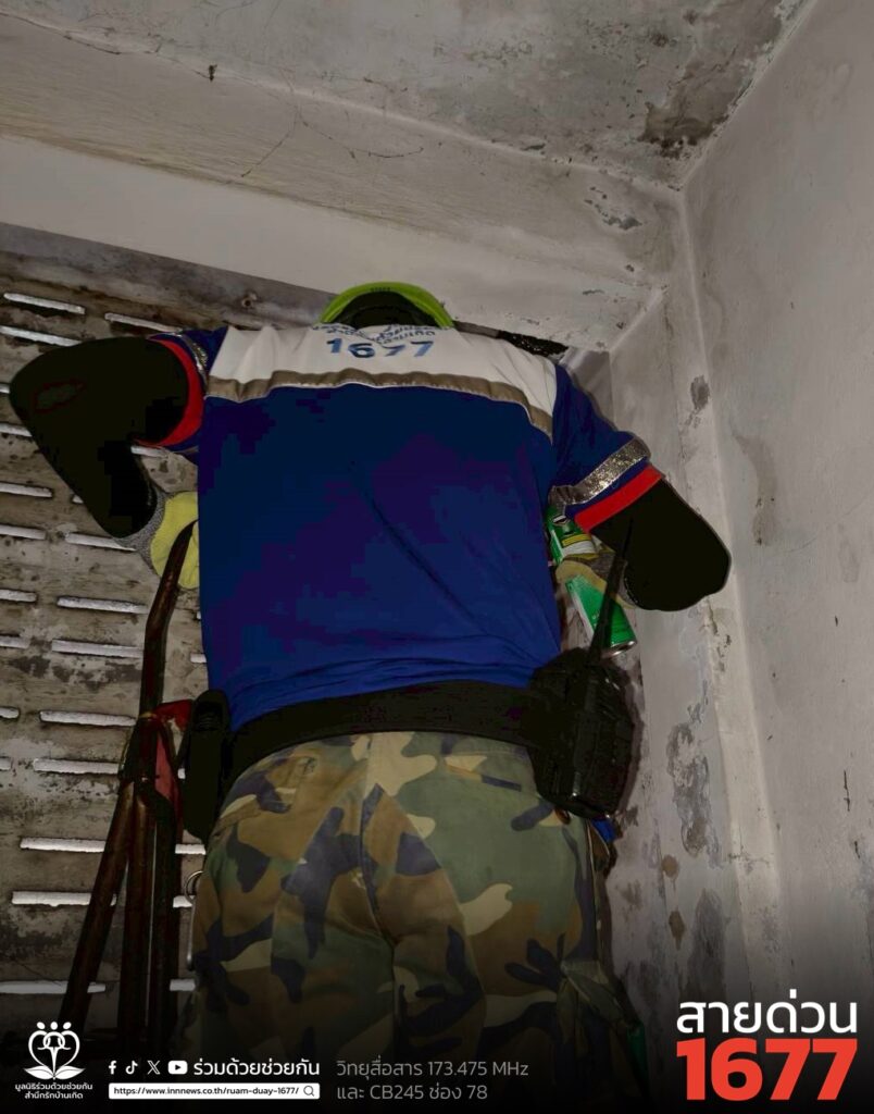 รับแจ้งจากประชาชนขอความช่วยเหลือ กำจัดรังผึ้งบนเพดานห้องน้ำภายในบ้าน ซอยนวมินทร์ 68 ถนนนวมินทร์ แขวงคลองกุ่ม เขตบึงกุ่ม กรุงเทพฯ ศูนย์สื่อสารร่วมด้วยฯ ประสาน อาสาร่วมด้วยคุ้มภัย 006 เข้าช่วยเหลือกำจัดรังผึ้งเรียบร้อย
