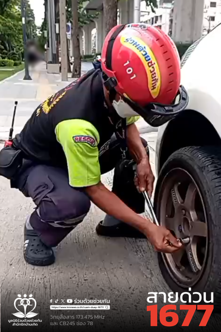 อาสาร่วมด้วยช่วยกันตรวจสอบ พบยางล้อหน้าซ้ายรั่ว อาสาช่วยเปลี่ยนล้อยางให้ สามารถเดินทางต่อไปได้ตามปกติ