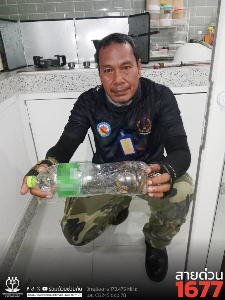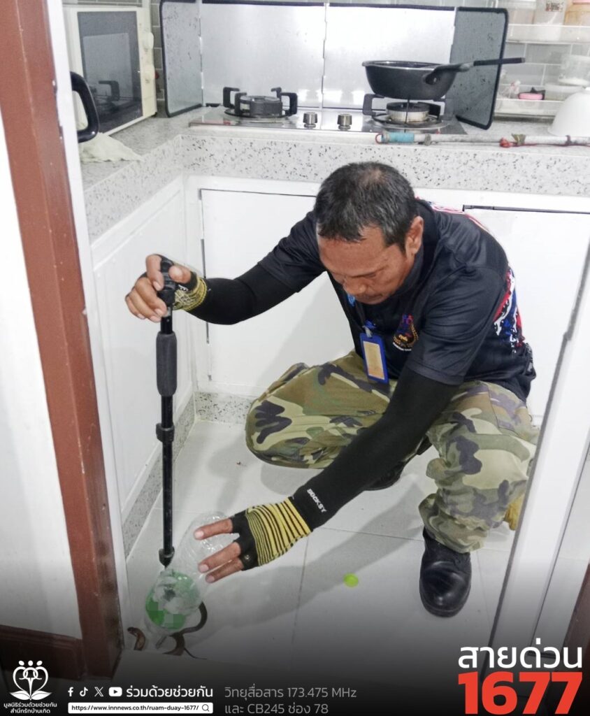 อาสาร่วมด้วยคุ้มภัย 006 ได้เข้าตรวจสอบพบเป็นงูเห่าจำนวน 1 ตัว อยู่ภายในห้องครัวของบ้านพัก จึงใช้อุปกรณ์เข้าช่วยเหลือ ทำการคล้องจับตัวงูเอาไว้ได้เป็นผลสำเร็จ พร้อมนำใส่ขวด และนำไปปล่อยคืนสู่ธรรมชาติห่างไกลบ้านเรือนประชาชนต่อไป พื้นที่ สน.นิมิตใหม่