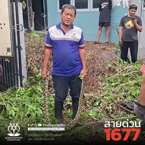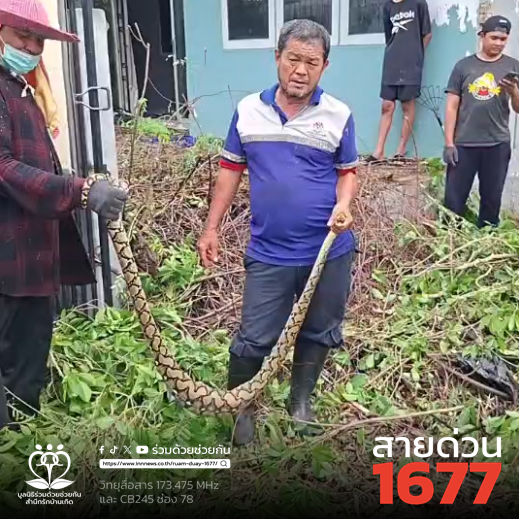 อาสาร่วมด้วยช่วยกันตรวจสอบ พบงูเหลือมขนาดใหญ่อยู่ภายในบริเวณบ้าน ที่ท้องป่องนูน เลื้อยเคลื่อนที่ได้ไม่สะดวก อาสาจึงช่วยจับตัวไว้ได้ ก่อนนำไปปล่อยคืนธรรมชาติต่อไป