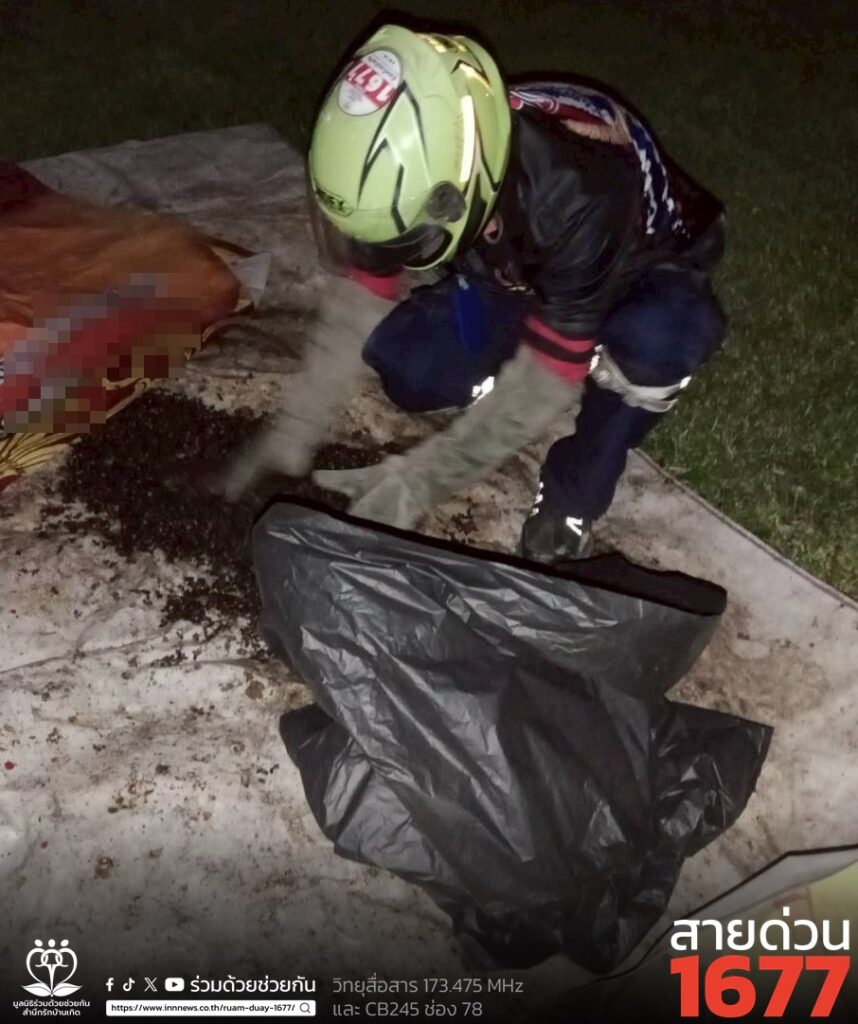 อาสาร่วมด้วยคุ้มภัย 006,038 ได้เข้าตรวจสอบ พบเป็นรังผึ้งหลวงจำนวน 1 รัง ทำรังอยู่บนต้นไม้ ความสูง 5 เมตร ภายในสนามเด็กเล่นภายในหมู่บ้าน จึงได้นำอุปกรณ์เข้าช่วยเหลือ ทำการกำจัดรมควัน และเก็บกวาดเคลื่อนย้ายนำออกนอกพื้นที่ให้เป็นที่เรียบร้อย พื้นที่ สน.คันนายาว