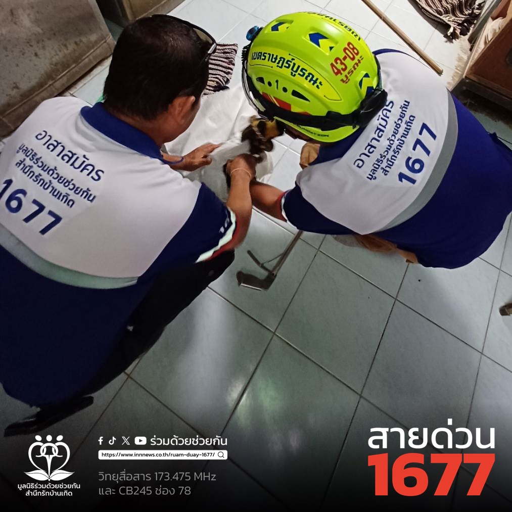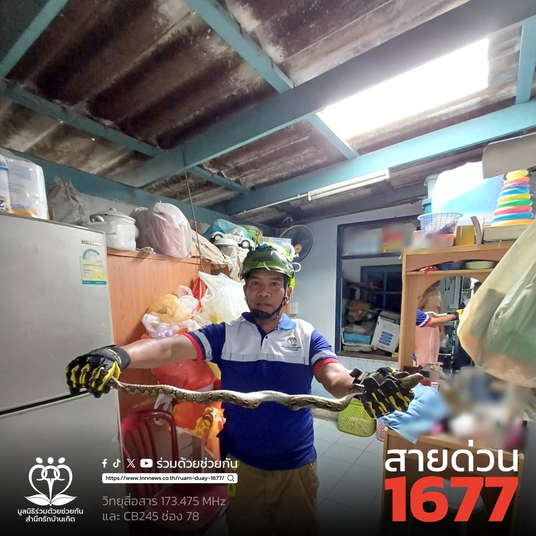 อาสาร่วมด้วยช่วยกันเดินทางเข้าไปตรวจสอบ พบงูเหลือมขดอยู่ใต้หลังบ้าน อาสาจึงนำอุปกรณ์คล้องจับตัวไว้ได้ ก่อนนำไปปล่อยคืนธรรมชาติต่อไป