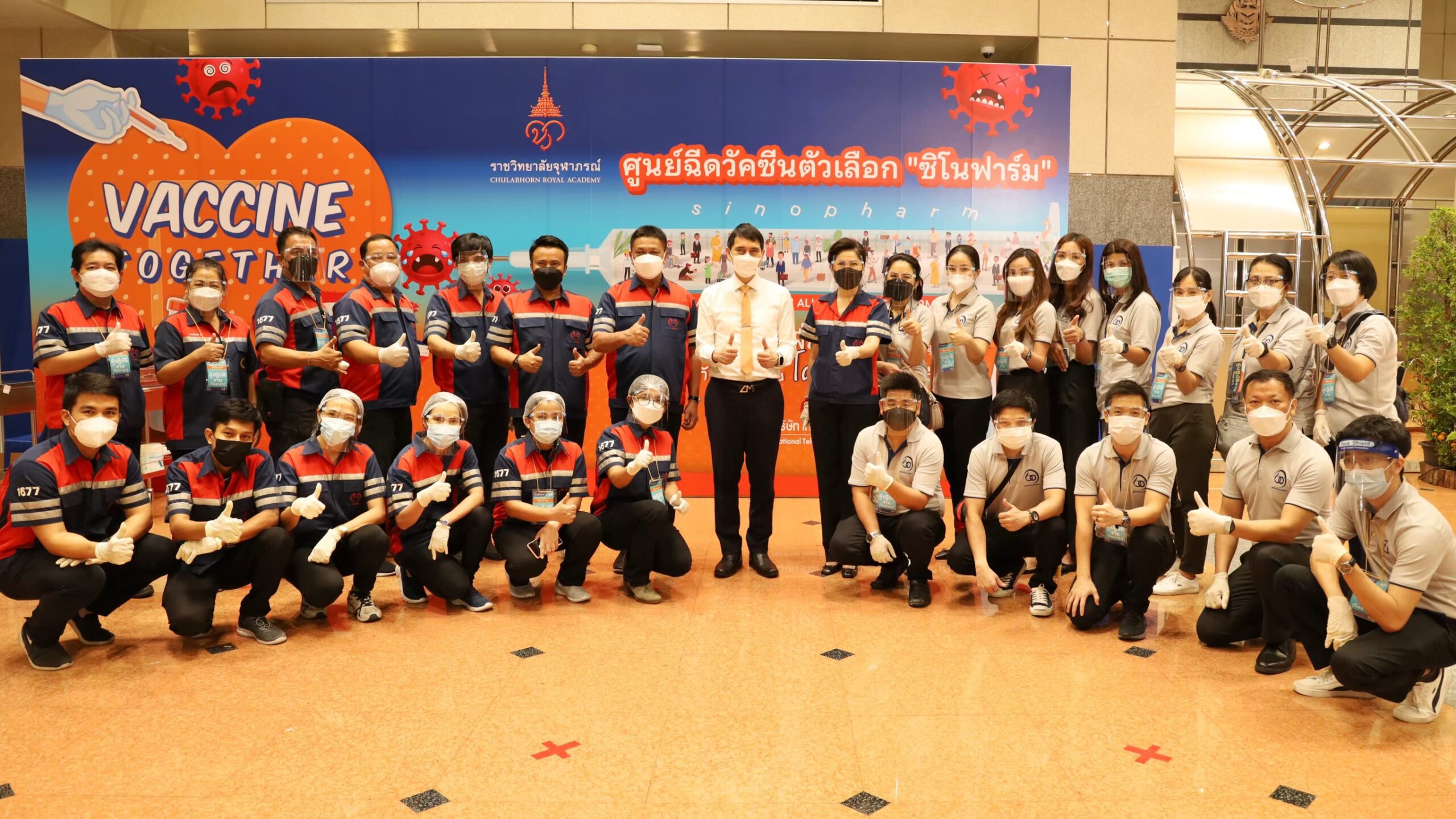 นายแพทย์ภูมินทร์ ศิลาพันธ์ รองผู้อำนวยการโรงพยาบาลจุฬาภรณ์ ตัวแทนมอบเข็มกลัดพระราชทาน ที่ระลึกจากสมเด็จพระเจ้าน้องนางเธอ เจ้าฟ้าจุฬาภรณวลัยลักษณ์ อัครราชกุมารี กรมพระศรีสวางควัฒน วรขัตติยราชนารี ให้แก่ คุณจุฑามาศ เบญจรงคกุล กรรมการ มูลนิธิร่วมด้วยช่วยกันสำนึกรักบ้านเกิด และทีมงานมูลนิธิร่วมด้วยช่วยกันสำนึกรักบ้านเกิด จากการเข้าร่วมเป็นจิตอาสาบริการประชาชนที่เข้ารับการฉีดวัคซีนต้านไวรัสโคโรน่า (COVID-19) ตั้งแต่วันที่ 24 พฤษภาคม 2564 จนถึงวันที่ 30 พฤศจิกายน 2564