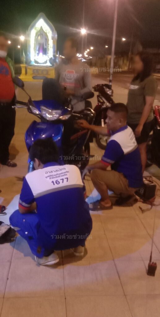 อาสาเข้าตรวจสอบพบรถจักรยานยนต์ ฮอนด้าเวฟ สีน้ำเงิน จอดเสียระบบหัวเทียน อาสาดำเนินการช่วยเหลือเปลี่ยนหัวเทียนให้เป็นที่เรียบร้อย รถสตาร์ทติดสามารถขับขี่ต่อไปได้