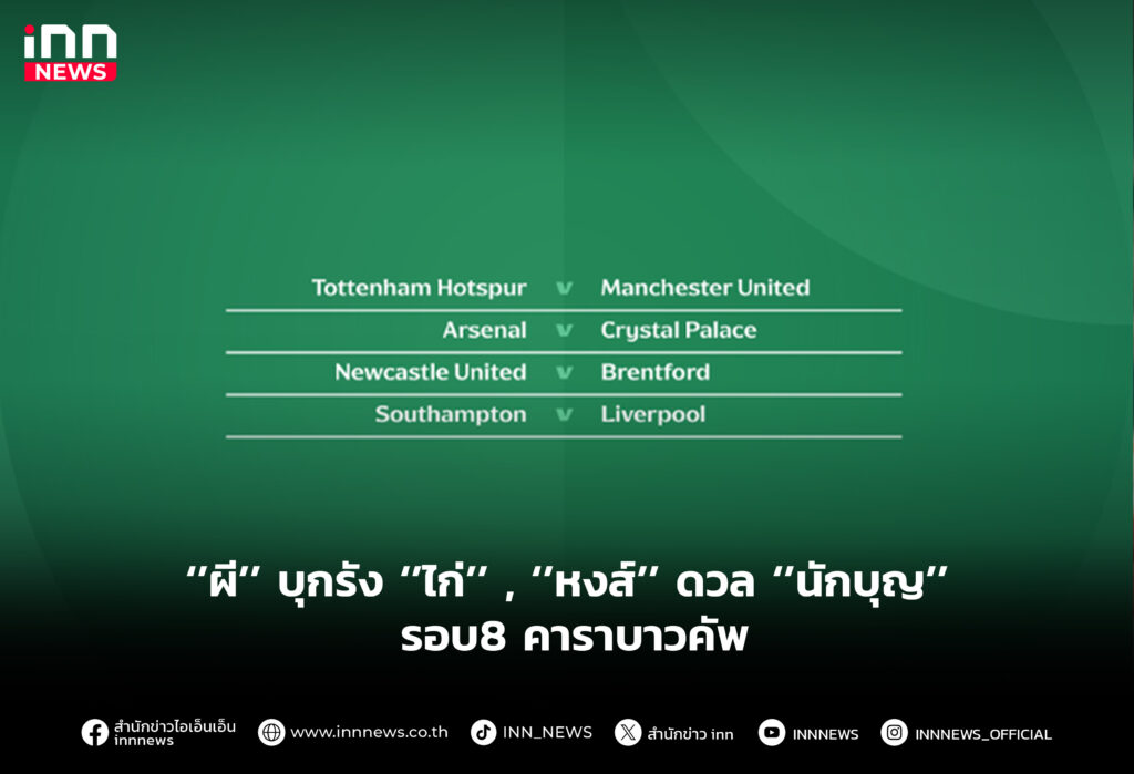 "บิ๊กแมตช์" คาราบาว คัพ รอบ 8 ทีมสุดท้าย ไก่เดือยทอง จะเปิดบ้านปะทะ ปิศาจแดง ขณะที่ หงส์แดง จะไปเยือน นักบุญ และ อาร์เซนอล รับมือ พาเลซ