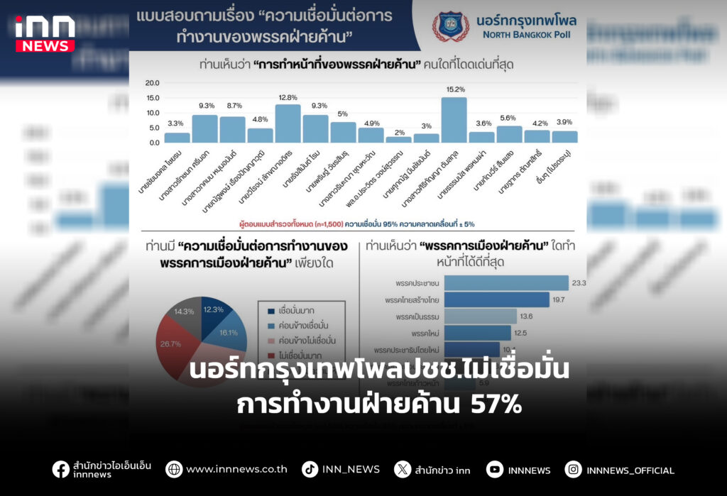 นอร์ทกรุงเทพโพลปชช.ไม่เชื่อมั่นการทำงานฝ่ายค้าน 57%