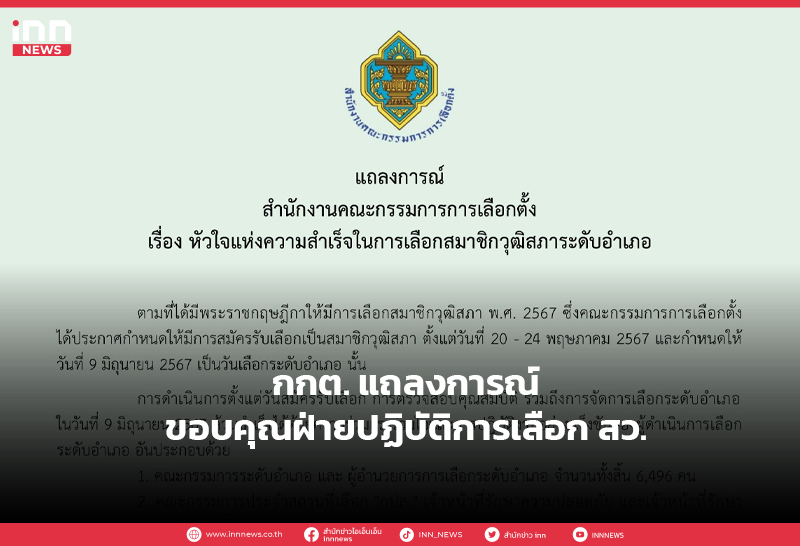 กกต. ออกแถลงการณ์ “หัวใจความสำเร็จในการเลือก สว. ระดับอำเภอ“ ขอขอบคุณฝ่ายปฏิบัติการ แนะยึดมั่นกฎระเบียบอย่างเคร่งครัด