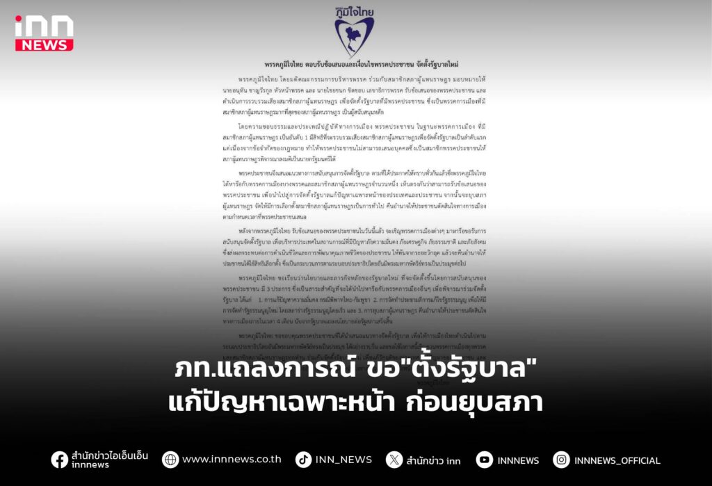 ภูมิใจไทย ออกแถลงการณ์ ขอ "ตั้งรัฐบาล" แก้ปัญหาเฉพาะหน้า ก่อน"ยุบสภา" ขอบคุณพรรคประชาชน เสนอแนวทางจัดตั้งรัฐบาล เพื่อให้การเมือง