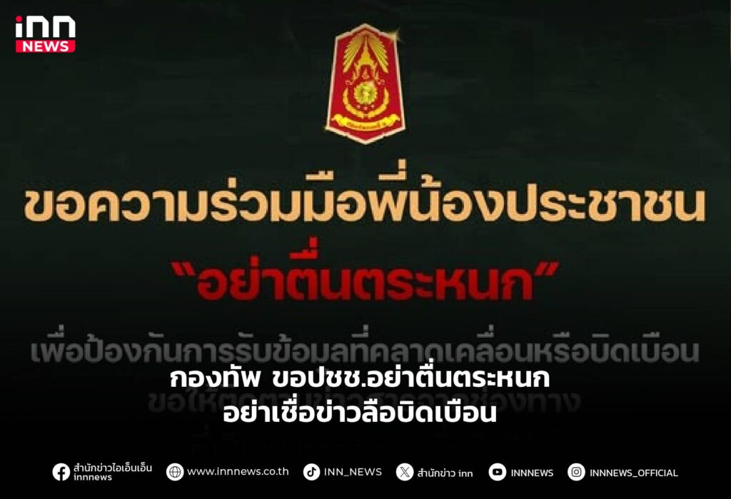 กองทัพ ขอความร่วมมือพี่น้องประชาชน "อย่าตื่นตระหนก" ขอให้ติดตามข่าวสารจากช่องทางที่เป็นทางการและเชื่อถือได้เท่านั้น