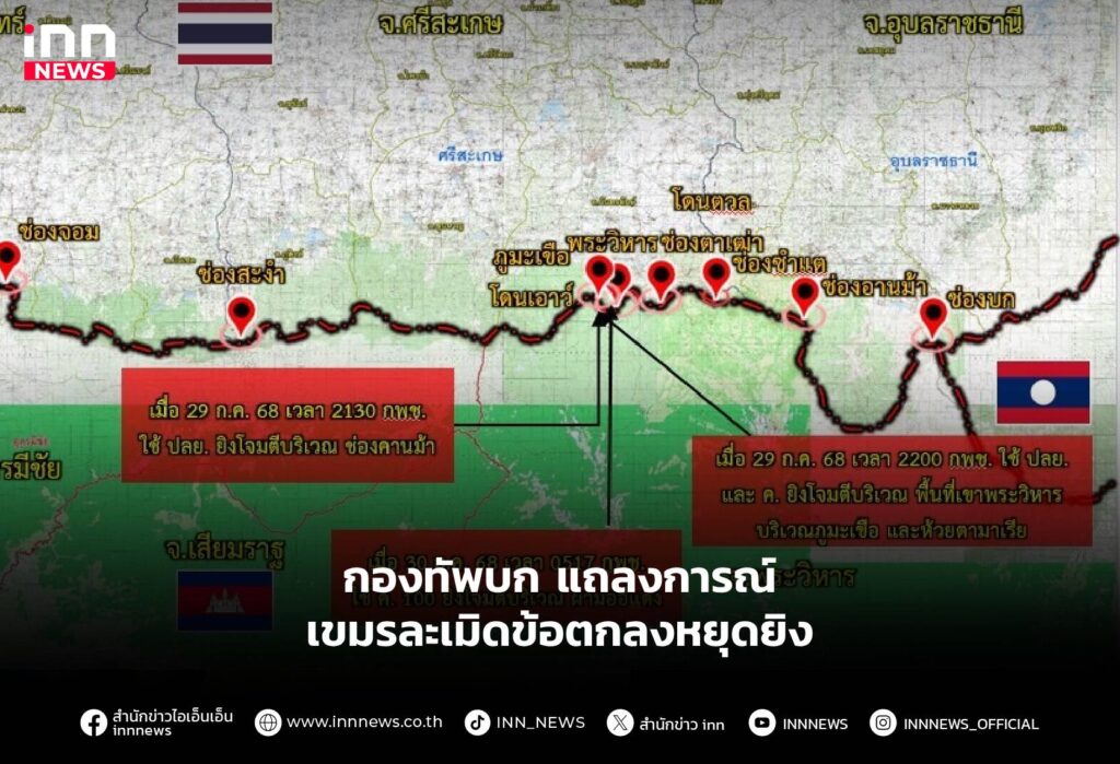 กองทัพบกออกแถลงการณ์เขมรละเมิดข้อตกลงหยุดยิง 3 พื้นที่ พร้อมประณามการกระทำอันไม่รับผิดชอบของกองทัพกัมพูชา
