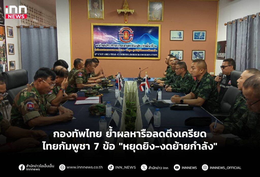กองทัพไทย ย้ำผลหารือลดความตึงเครียดชายแดนไทย-กัมพูชา 7 ข้อ หยุดยิง-คุ้มครองประชาชน- งดเสริม-ห้ามเคลื่อนย้ายกำลัง อำนวยความสะดวกส่งกลับ- ตั้งชุดประสานงานเฉพาะกิจ-รอผลประชุม GBC