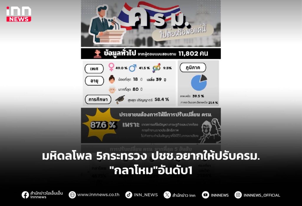 มหิดลโพล 5กระทรวง ปชช.อยากให้ปรับครม.”กลาโหม”อันดับ1