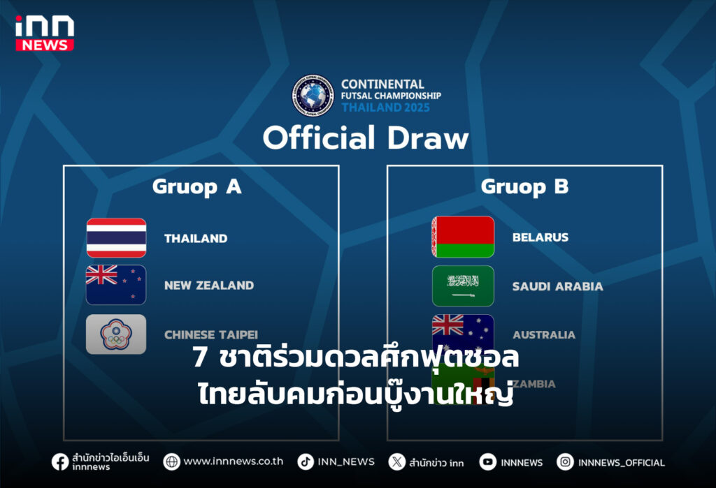 ผลจับสลากแบ่งสาย คอนตินเนตัล ฟุตซอล 2025 ทีมชาติไทย อยู่กลุ่ม A กับ นิวซีแลนด์ และ ไชนีส ไทเป ดวลนัดแรก 29 กรกฎาคม 2568