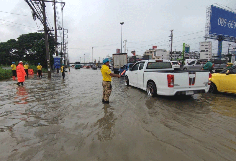 นอภ.คลองหลวง ปทุมธานี ร่วมหลายหน่วยงานลุยฝนโบกรถอำนวยจราจรปชช.หลังน้ำท่วมถนน