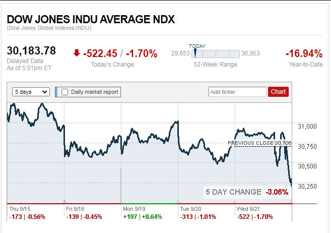 ดาวโจนส์ปิดลบ 522.45 จุด น้ำมันลง ทองขึ้น
