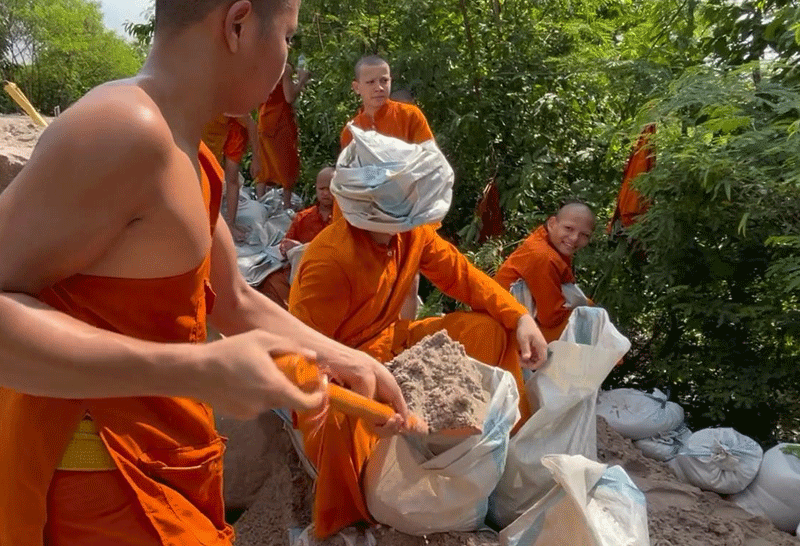 พระสงฆ์ขอนแก่นและชาวบ้านช่วยกันบรรจุทรายใส่กระสอบเพื่อปิดทางน้ำ และซ่อมพนังกั้นน้ำชี ป้องกันน้ำท่วมเขตเมืองขอนแก่น