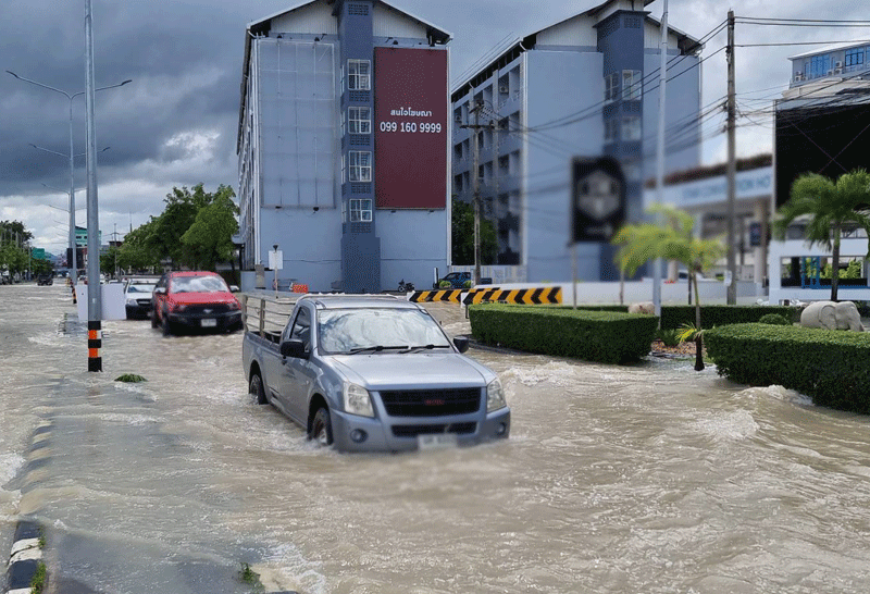 ปภ.ระยองรายงานเกิดน้ำท่วมขังถนนสายหลักใน อ.เมืองระยอง – เร่งระบายน้ำออกจากผิวถนน