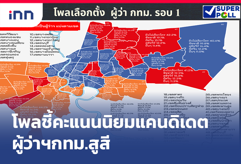 ซูเปอร์โพลชี้ คนกรุง ยังไม่เทใจเลือกแคนดิเดเดต ผู้ว่าฯ กทม. หลังพบคะแนนความนิยมสูสีกัน สุชัชวีร์ ได้ร้อยละ 27.1 ขณะ ชัชชาติ ได้ร้อยละ 24.9