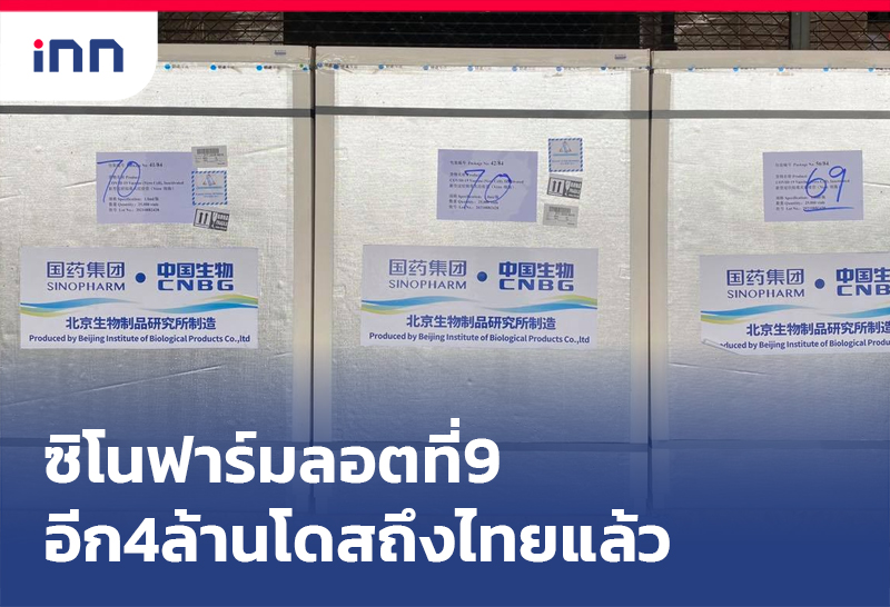 ราชวิทยาลัยจุฬาภรณ์ เผย วัคซีนซิโนฟาร์มลอตที่ 9 จำนวน 4 ล้านโดส เดินทางมาถึงท่าอากาศยานสุวรรณภูมิแล้วเตรียมทยอยจัดส่ง