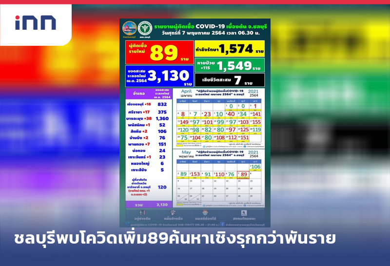 จังหวัดชลบุรีพบผู้ติดเชื้อโควิด-19เพิ่ม 89 ราย ค้นหาผู้สัมผัสเสี่ยงอีก 122 ตรวจเชิงรุกกว่าพันราย