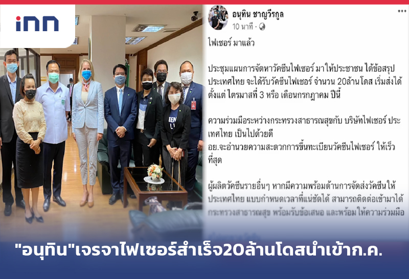 "อนุทิน"เจรจาไฟเซอร์สำเร็จ 20 ล้านโดส เตรียมทยอยนำเข้าไทย ก.ค. นี้