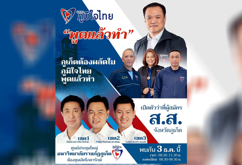 "อนุทิน" บุกภูเก็ต เปิดตัว 3 ว่าที่ผู้สมัคร ส.ส.คนรุ่นใหม่ 3 ธ.ค.นี้ ด้าน นาที แม่ทัพภาคใต้ อ้อน ชาวภูเก็ต ฝาก 3 หนุ่มภูมิใจไทยไว้รับใช้ พัฒนาเมืองภูเก็ต