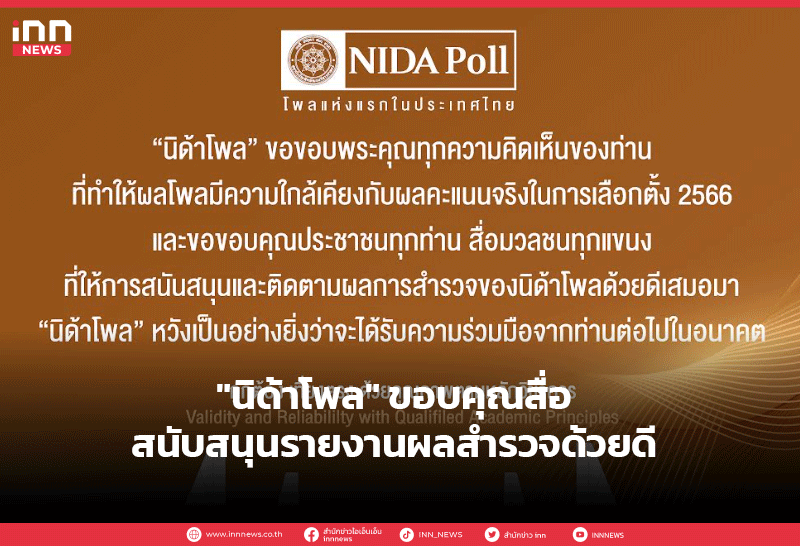 "นิด้าโพล" ขอบคุณสื่อสนับสนุนรายงานผลสำรวจด้วยดีเสมอมา ยันผลโพลมีความใกล้เคียงผลเลือกตั้งจริง