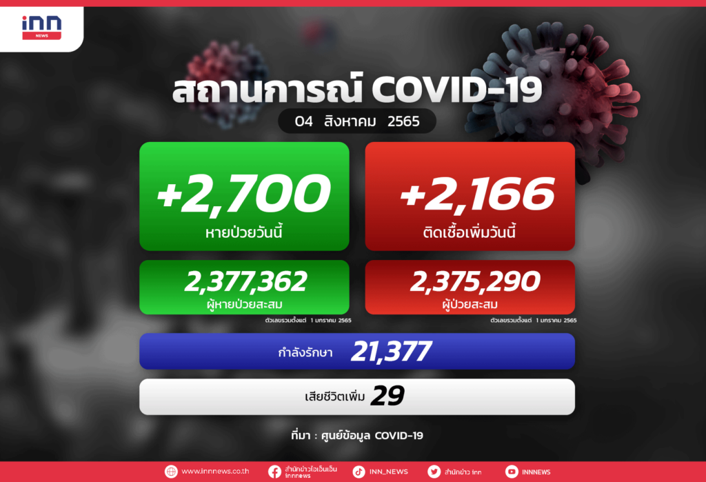 ทรงตัว! ป่วยโควิดใหม่รักษาตัวรพ. 2166 – เสียชีวิต 29