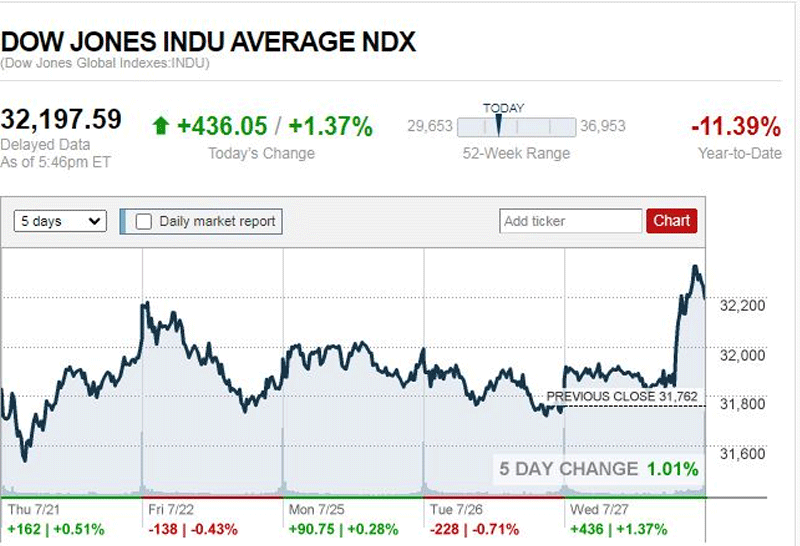 ดาวโจนส์ปิดบวก 436.05 จุด น้ำมัน/ทองขึ้น