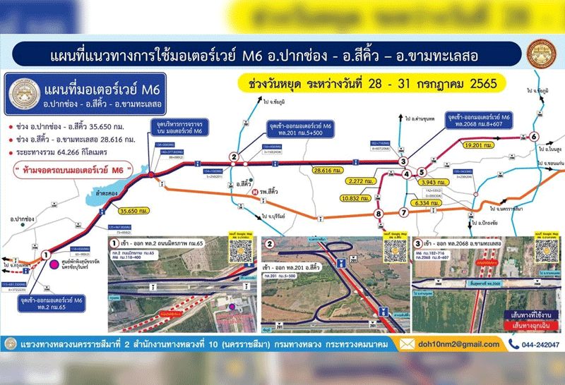 กรมทางหลวง เปิดวิ่งฟรีชั่วคราวมอเตอร์เวย์ สายบางปะอิน – นครราชสีมาช่วงปากช่อง - สีคิ้ว -ขามทะเลสอ ระยะทาง 64 กิโลเมตร ช่วงหยุดยาว 28 – 31 กรกฎาคมนี้ แบ่งเบาถนนมิตรภาพ