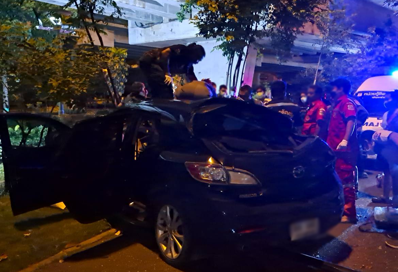 พีอาร์สาว ขับรถเก๋งตกทางด่วนรามอินทรา ติดภายใน กู้ภัยช่วยเหลือนำส่งรพ. เจ้าหน้าที่คาดหลับใน