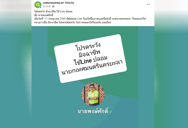 คนร้ายปลอม Line ของนายกเทศมนตรีนครยะลา หลอกให้โอนเงิน 1 ล้าน อ้างบริษัทเพื่อนต้องการเงินหมุน